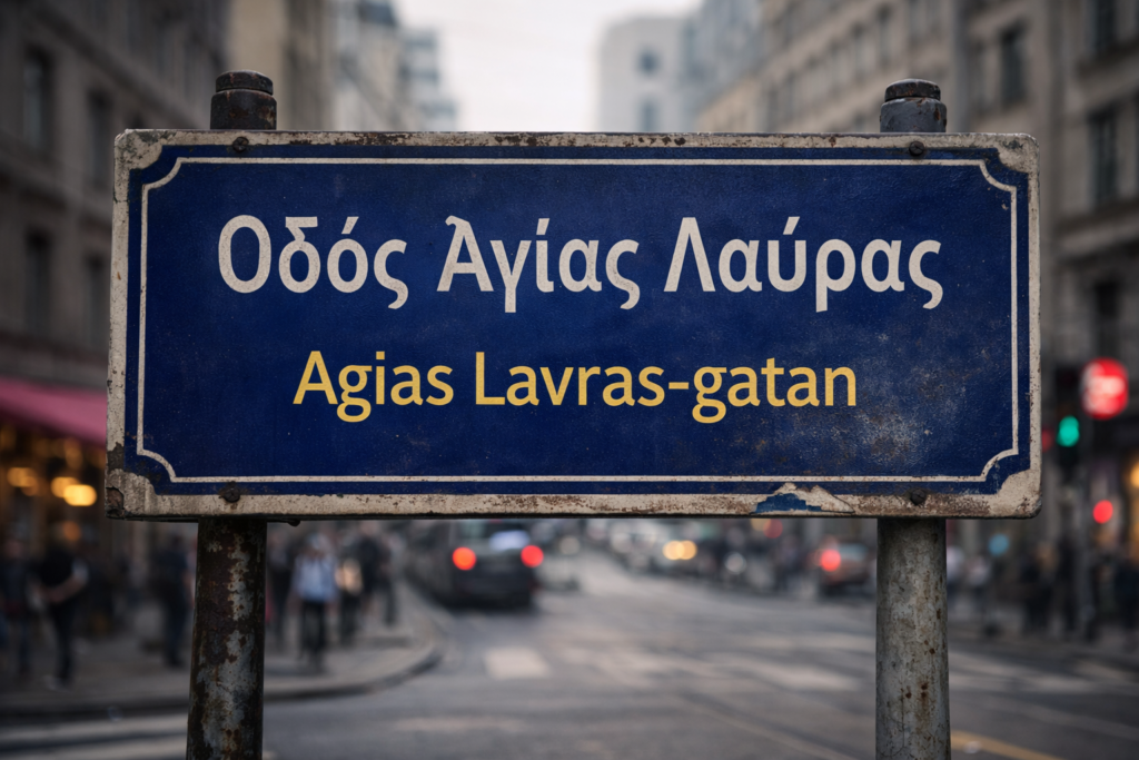 Jag stod vid busshållplatsen vid Hornstull. Allt såg normalt ut. Trafiken, människorna, stadens ljud i bakgrunden. Min blick fastnade på en vägskylt. Den såg inte svensk ut utan var utformad som många gatuskyltar i Grekland, där namnet skrivs både med grekiska och latinska bokstäver: Οδός Αγίας Λαύρας / Agias Lavras-gatan.